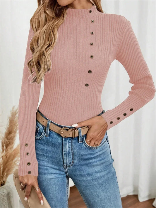 Blusa Elegante de Malha com Botões e Manga Comprida – Camada Confortável